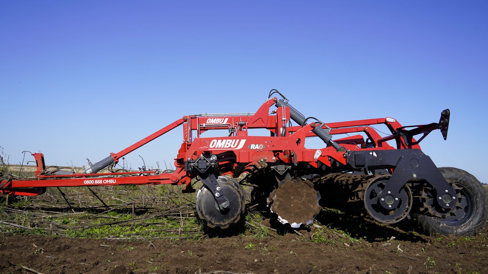 Profundidad de trabajo 0 – 120mm. Regulada por el sistema de rolos desterronadores balancín con un rolo delantero de mayor diámetro, Ø 480mm. fabricado con redondos dispuestos de forma helicoidal y rolo trasero de menor diámetro Ø420mm. fabricado con planchuelas dispuestas de forma perpendicular al avance de la máquina, que culmina la rotura de terrones. Accionados mediante cilindros hidráulicos compensados para asegurar una regulación uniforme en todo el ancho de trabajo de  la máquina, la profundidad de trabajo puede variar según las condiciones de suelo.